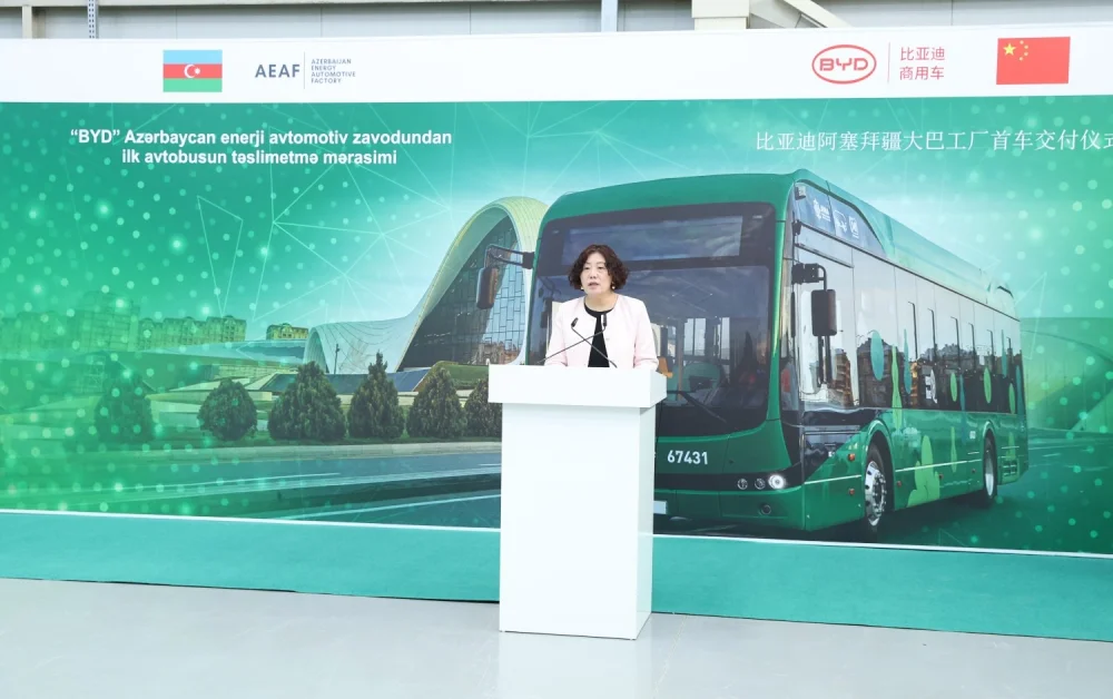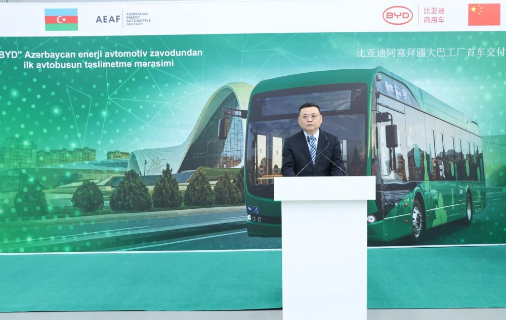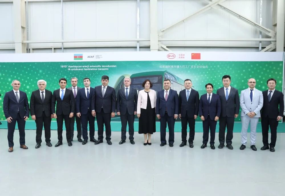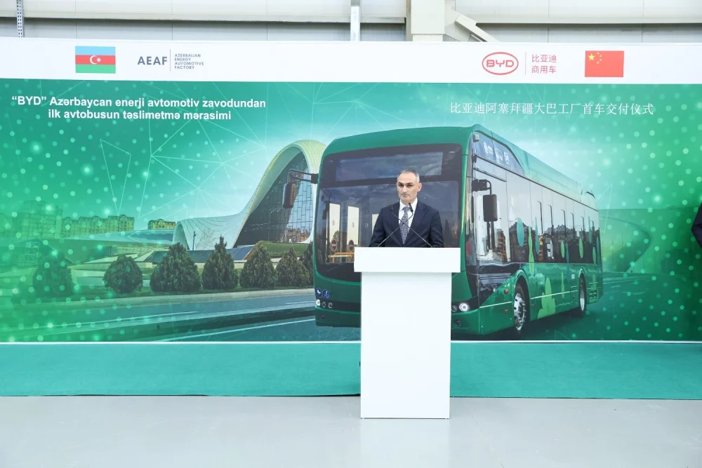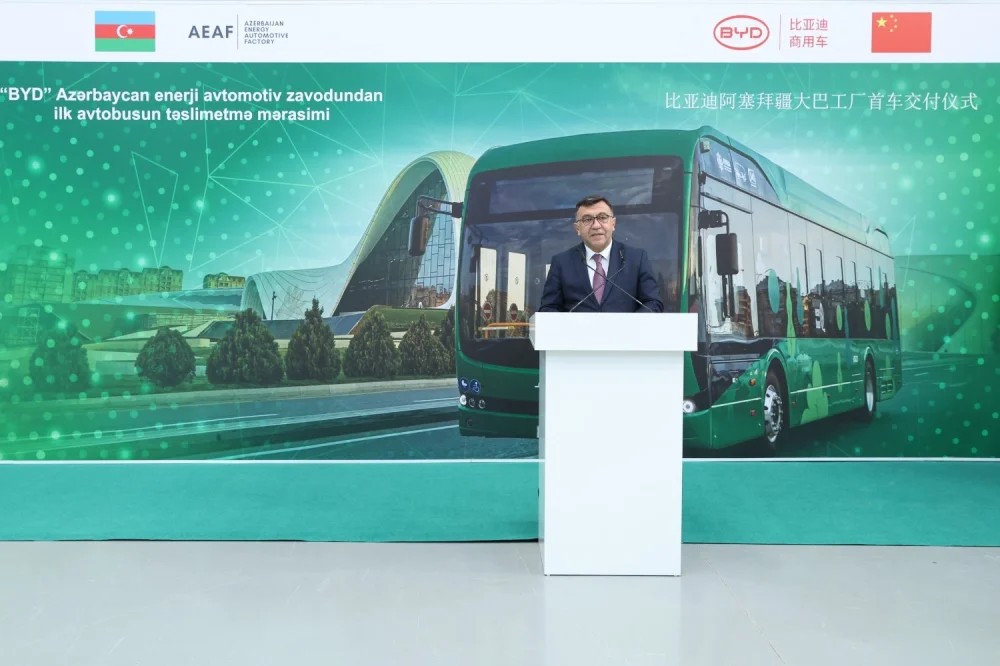 Sumqayıt Sənaye Parkında “BYD” “Azerbaijan Energy Automotive Factory” MMC-nin istehsal etdiyi ilk elektrik avtobusu “BakuBus” MMC-yə təqdim olunub.