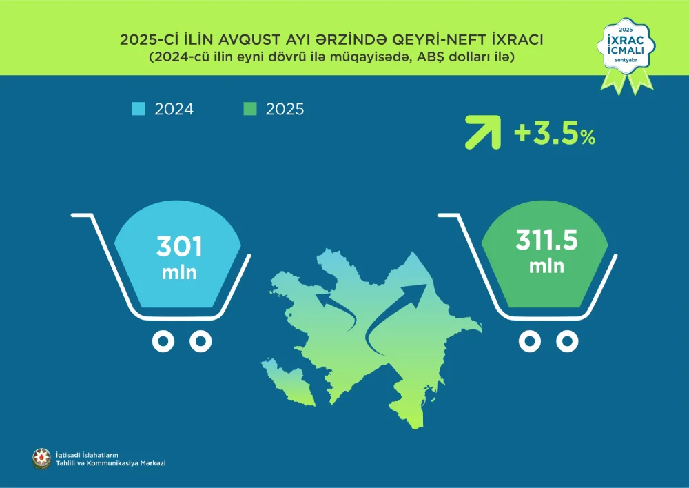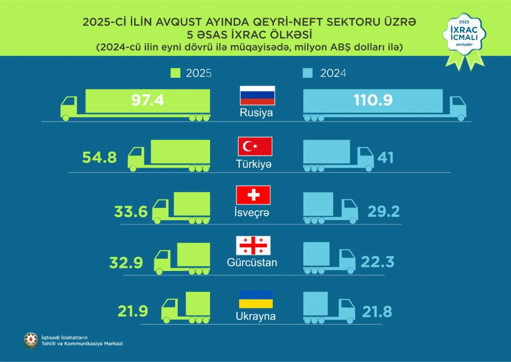 2025-ci ilin avqust ayında Rusiya Federasiyasına 97,4 milyon ABŞ dolları, Türkiyəyə 54,8 milyon ABŞ dolları, İsveçrəyə 33,6 milyon ABŞ dolları, Gürcüstana 32,9 milyon ABŞ dolları, Ukraynaya isə 21,9 milyon ABŞ dolları dəyərində qeyri-neft sektoruna aid mal ixrac edilib.