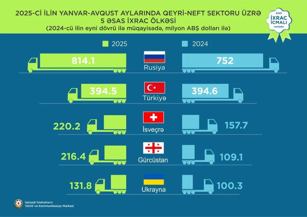 Cari ilin səkkiz ayında Rusiya Federasiyasına 814,1 milyon ABŞ dolları, Türkiyəyə 394,5 milyon ABŞ dolları, İsveçrəyə 220,2 milyon ABŞ dolları, Gürcüstana 216,4 milyon ABŞ dolları, Ukraynaya isə 131,8 milyon ABŞ dolları dəyərində qeyri-neft sektoruna aid mal ixrac olunub.