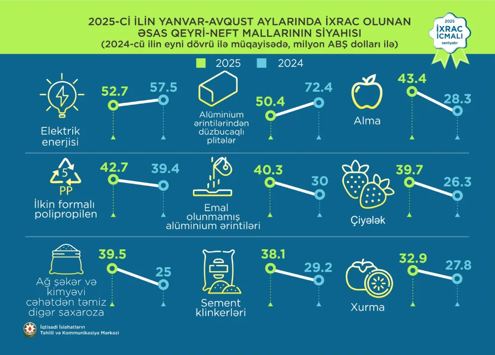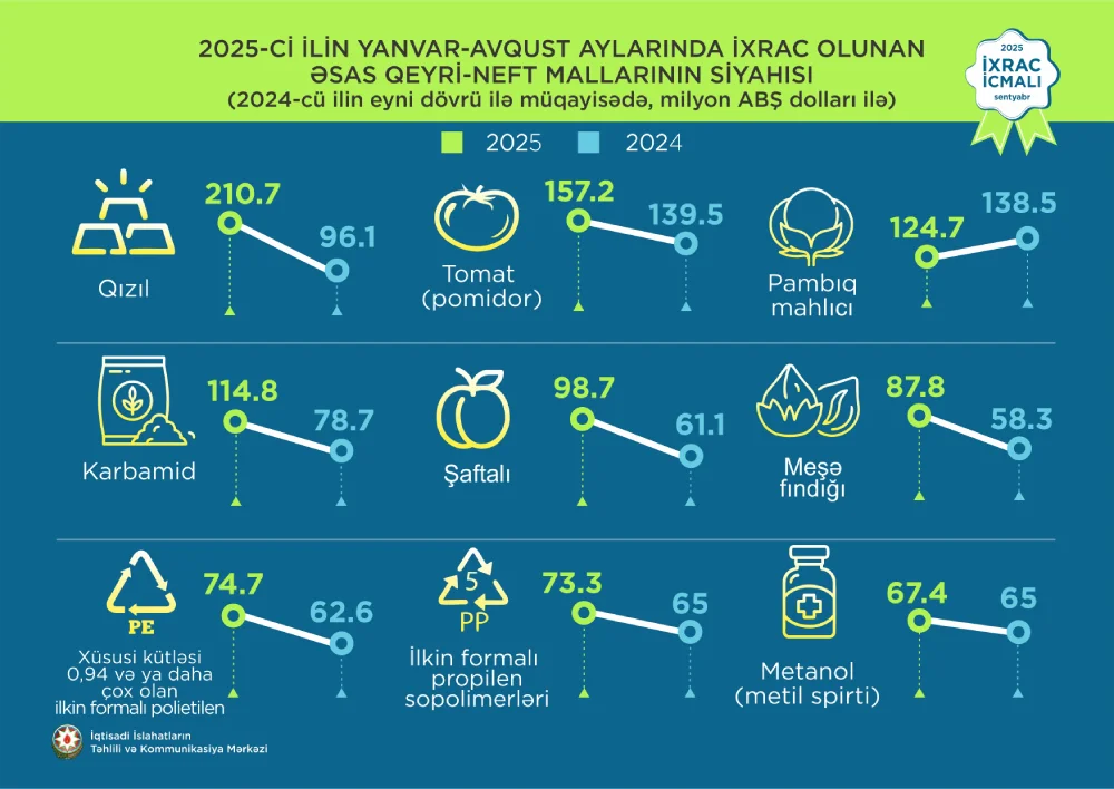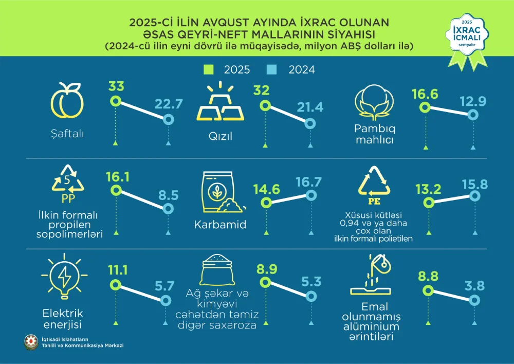 2025-ci ilin avqust ayı ərzində ixrac edilmiş qeyri-neft sektoruna aid malların siyahısında şaftalı (33 milyon ABŞ dolları) birinci olub. Bu siyahıda qızıl (32 milyon ABŞ dolları) ikinci, pambıq lifi (16,6 milyon ABŞ dolları) isə üçüncü yerdə qərarlaşıb.