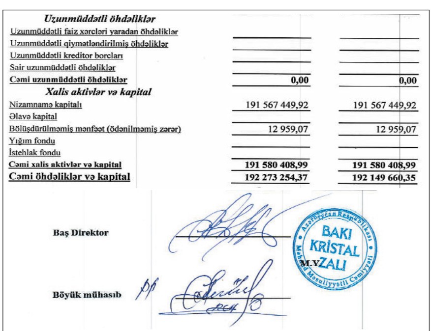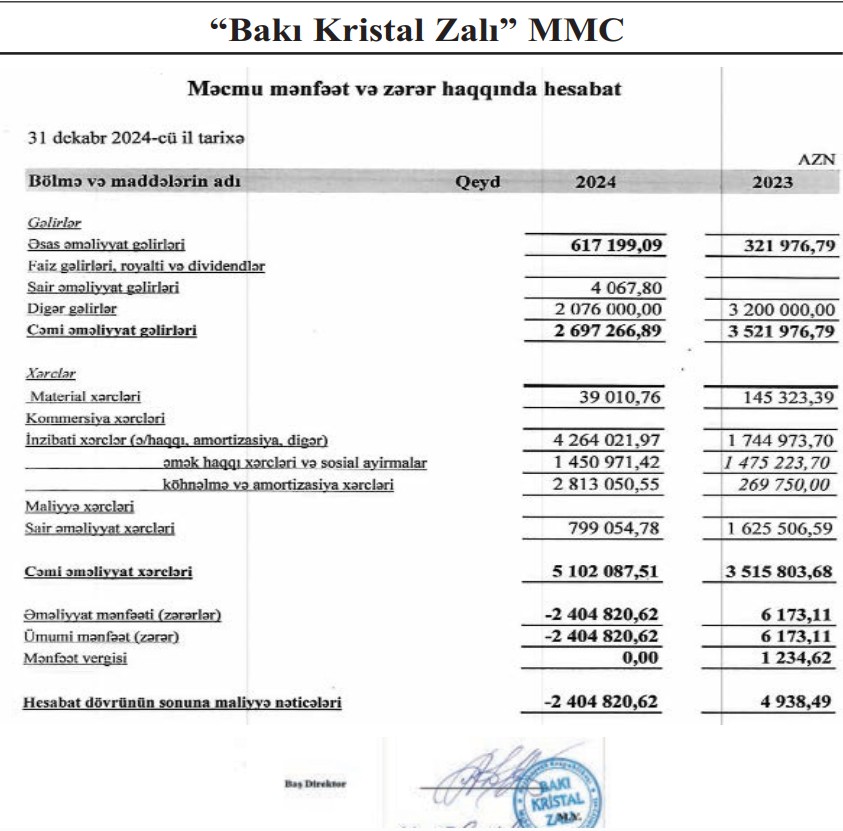 "Bakı Kristal Zalı" MMC 2024-cü ili 2 milyon 405 min manat xalis zərər ilə başa vurub. Halbuki, şirkət 2023-cü ili 4938 manat xalis mənfəət ilə bağlamışdı. "Bakı Kristal Zalı"nın zərər ilə üzləşməsi gəlirlərinin azalması ilə bərabər xərclərinin də artmasıdır.