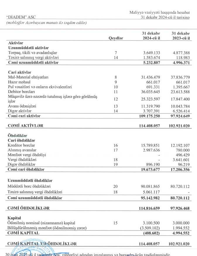 31 dekabr 2024-cü il tarixində "Diadem" ASC 114 milyon 408 min manat cəmi aktivlərə malik olub. Şirkət 2023-cü ilin sonunda 102 milyon 921 min manat cəmi aktivlərə malik idi. Aktivlərin həcminin artması debitor borcların 12 milyon 422 min manat artaraq 36 milyon 35 min manata yüksəlməsilə əlaqədardır.