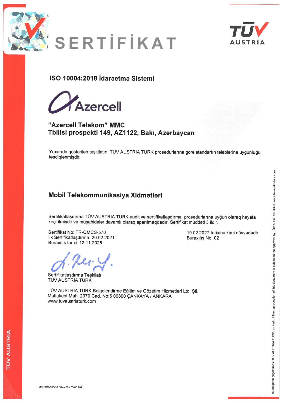 Qeyd edək ki, Azercell ISO 10004:2018 standartı üzrə ilk sertifikatını 2021-ci ildə qazanıb. Şirkət ardıcıl olaraq dördüncü dəfə ISO 10004 sertifikatına layiq görülür.