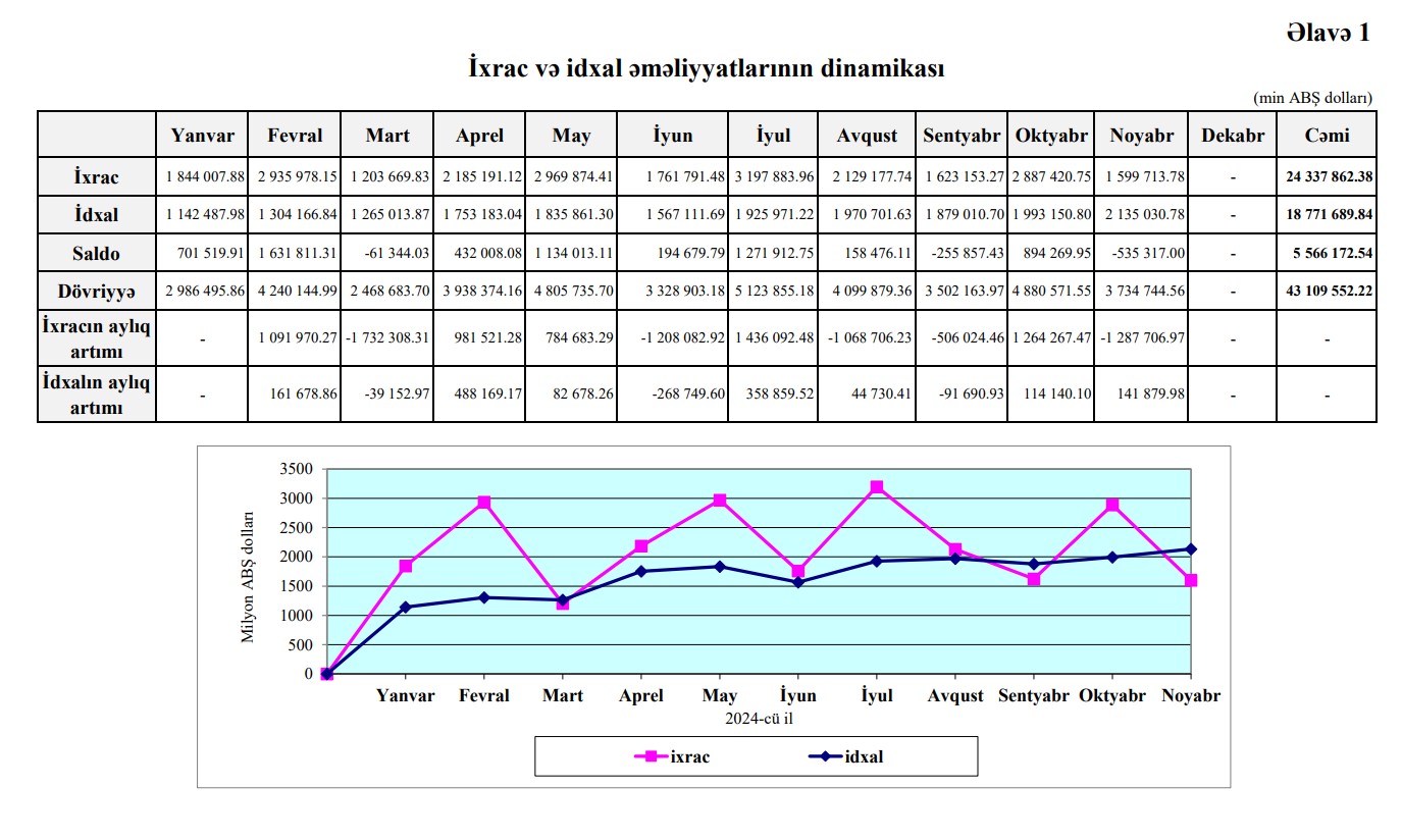 Müqayisə üçün qeyd edək ki, 2024-cü ilin 11 ayı ərzində Azərbaycanın xarici ticarət əməliyyatlarının həcmi 43 milyard 109 milyon 552 min ABŞ dolları, o cümlədən idxal əməliyyatları 18 milyard 771 milyon 690 min ABŞ dolları, ixrac əməliyyatları 24 milyard 337 milyon 862 min ABŞ dolları olmuş, müsbət saldo 5 milyard 566 milyon 172 min ABŞ dolları təşkil etmişdi.