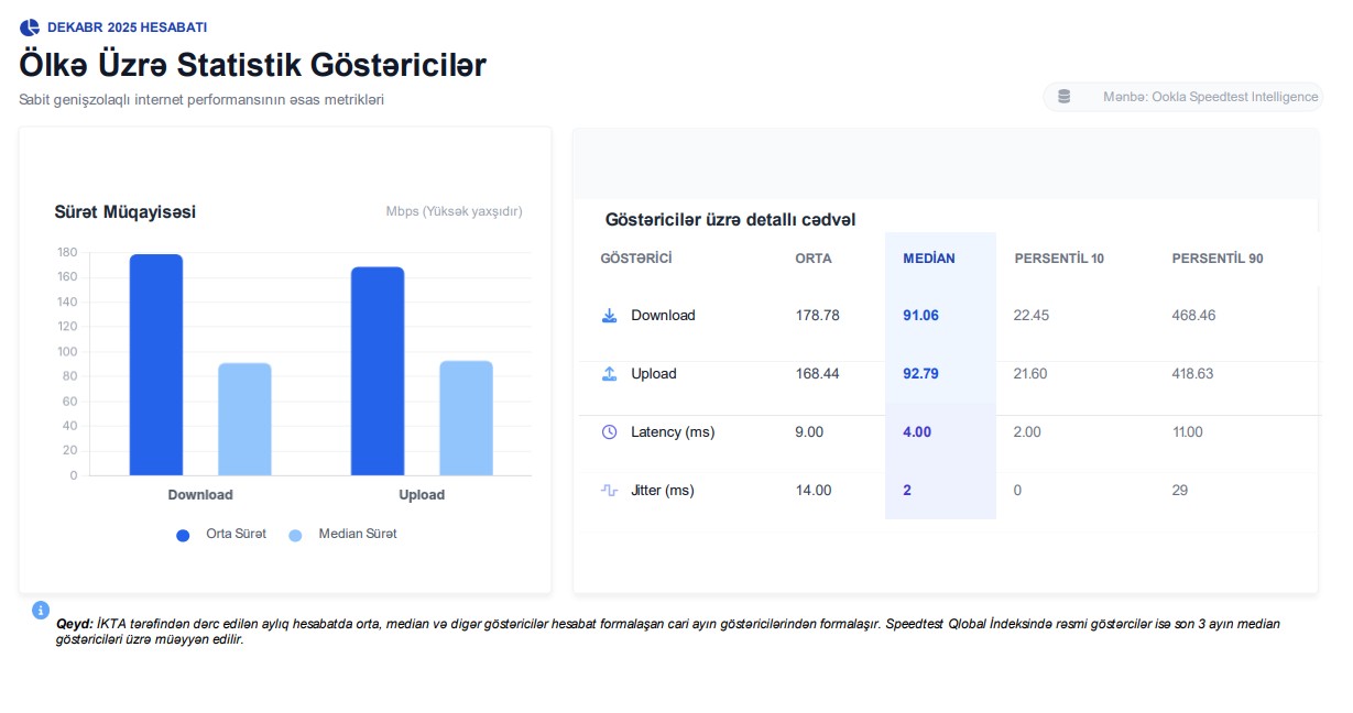 Azərbaycanın telekommunikasiya və poçt xidmətləri üzrə tənzimləyici qurumu İnformasiya Kommunikasiya Texnologiyaları Agentliyi (İKTA) qlobal internet performans qiymətləndirici platforması olan “Ookla”nın metodologiyası əsasında sabit genişzolaqlı internet üzrə provayderlərin 2025-ci ilin dekabr ayı üzrə internet sürət göstəricilərini dərc edib.