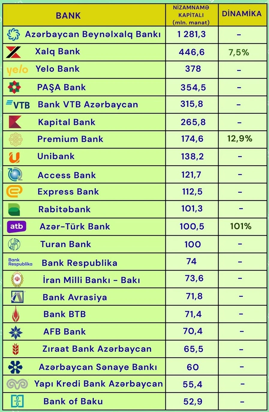 Son 1 ildə 22 bankdan 3-nün – “Azər-Türk Bank”, “Premium Bank” və “Xalq Bank”ın nizamnamə kapitalı artıb. Müvafiq olaraq 2 dəfə, 12,9% və 7,5%.
