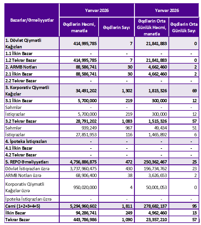 O cümlədən, Birjada REPO əməliyyatlaının həcmi 2025-ci ilin Yanva ayındakı 9 milyard 868 milyon 20 min manatdan 2026-cı ilin Yanvar ayında 4 milyard 756 milyon 887 min manata düşüb (2,1 dəfə azalıb).