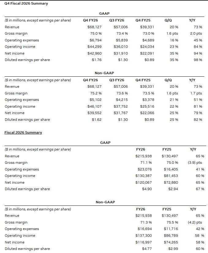 NVIDIA 25 yanvar 2026-cı il tarixində başa çatan dördüncü rüb üzrə 68,1 milyard dollar məbləğində rekord gəlir əldə etdiyini açıqlayıb. Bu, əvvəlki rüblə müqayisədə 20%, ötən ilin eyni dövrü ilə müqayisədə isə 73% artım deməkdir. 2026-cı maliyyə ili üzrə gəlir 215,9 milyard dollar olub ki, bu da ötən illə müqayisədə 65% artım göstərir.ABŞ-ın çip istehsalçısı, Kaliforniya ştatında yerləşən Nvidia şirkətinin gəliri 3 aylıq dövrdə illik müqayisədə 73 faiz artaraq 68,1 milyard dollar təşkil edib və bazar gözləntilərini üstələyib.