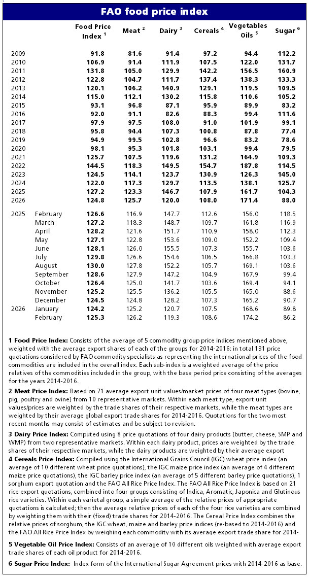 FAO Bitki Yağları Qiymətləri İndeksi fevralda orta hesabla 174,2 bənd olub ki, bu da aylıq müqayisədə 5,6 bənd (3,3 faiz) artım deməkdir və 2022-ci ilin iyunundan bəri ən yüksək səviyyədir. Artım əsasən palma, soya və raps yağlarının bahalaşması ilə bağlıdır və bu artım günəbaxan yağı qiymətlərindəki enişi üstələyib. Palma yağı qiymətləri üçüncü ay ardıcıl artıb; buna qlobal idxal tələbinin güclü olması və Cənub-Şərqi Asiyada mövsümi olaraq istehsalın azalması səbəb olub.