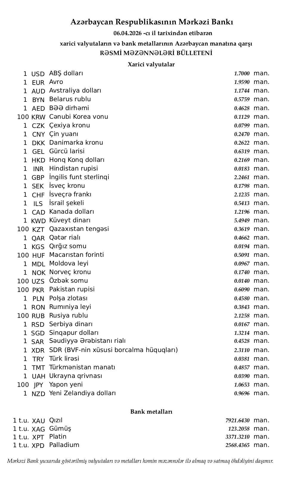 Rəsmi məzənnələr açıqlandı