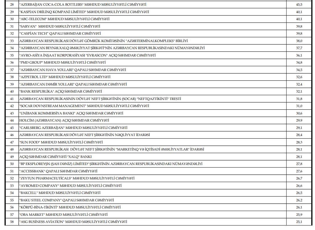 Azərbaycanda ən çox vergi ödəyən 100 şirkətin adı açıqlandı - SİYAHI