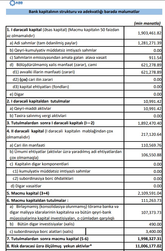 Hesabat dövrünün sonunda ABB-nin məcmu kapitalı 1 milyard 998 milyon 327 min manata çatıb. Bu məbləğ 2025-ci ilin sonu ilə müqayisədə 98 milyon 613 min manat və ya 5,2 % çoxdur. Güclü kapital bankın dayanıqlılığını və kreditləşmə imkanlarını artıran əsas faktorlardan biridir.