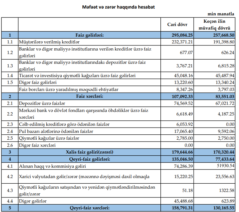 2026-cı ilin ilk rübündə bankın faiz gəlirləri 295 milyon 84 min manat təşkil edib. Bu, ötən ilin eyni dövrü ilə müqayisədə 37 milyon 415 min manat və ya 14,5 % artım deməkdir. 2025-ci ilin ilk rübündə faiz gəlirləri 257 milyon 669 min manat olmuşdu.