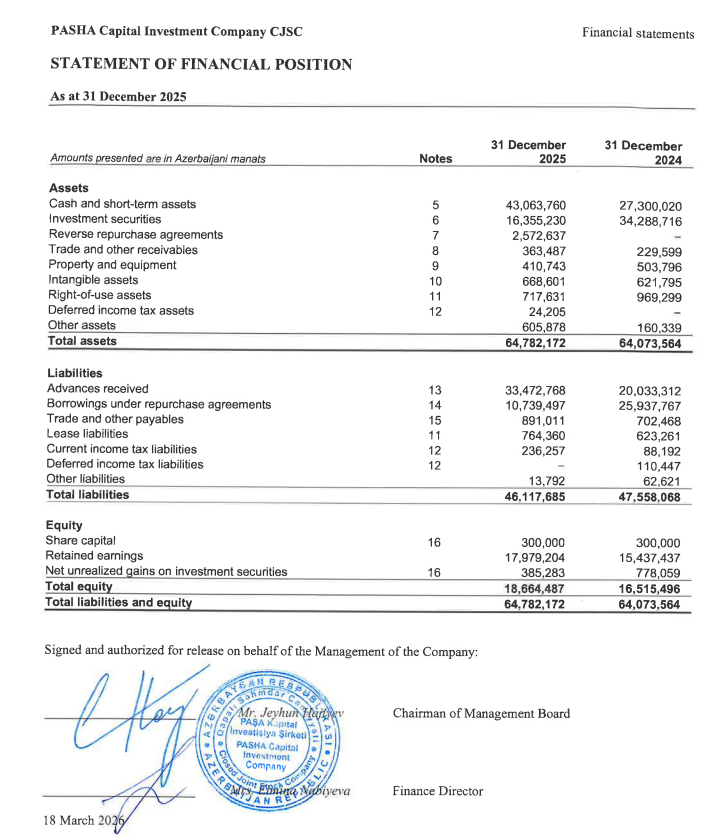 31 dekabr 2025-ci il tarixində "PAŞA Kapital İnvestisiya Şirkəti" QSC 64 milyon 782 min manat cəmi aktivlərə malik olub. Şirkət 2024-cü ilin sonunda 64 milyon 74 min manat cəmi aktivlərə malik idi.
