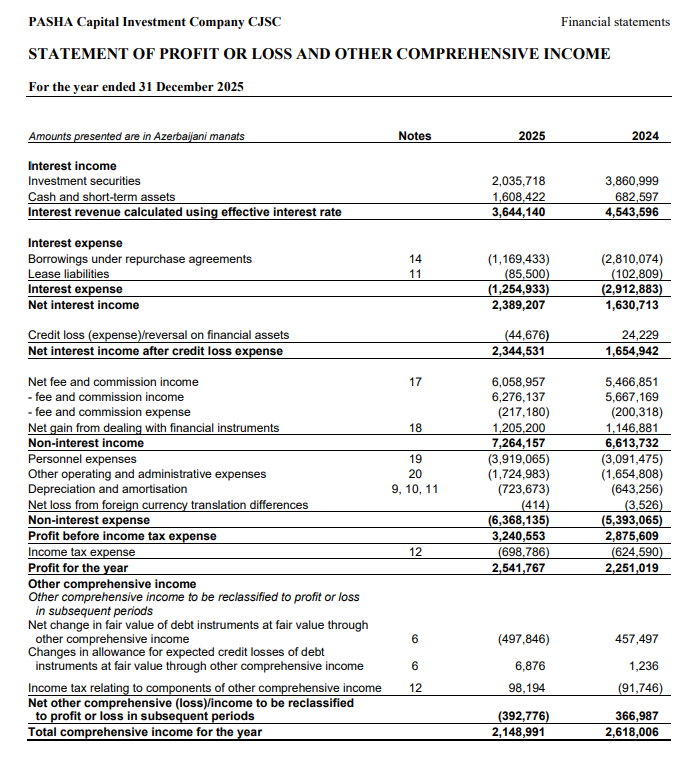 Marja.az-ın Şirkətin maliyyə hesabatlarına istinadən məlumatına görə, "PAŞA Kapital"ın faiz gəlirləri 2024-cü ildə 4 milyon 544 min manat ikən, 2025-ci ildə 3 milyon 644 min manat təşkil edib (899 min manat və ya 19,8% azalıb). Ötən il Şirkətin faiz xərcləri isə 1 milyon 658 min manat və ya 132% azalaraq 1 milyon 254 min manata düşüb. Xərlər gəlirlərdən daha çox azaldığına görə, şirkətin xalis faiz gəliri artıb.