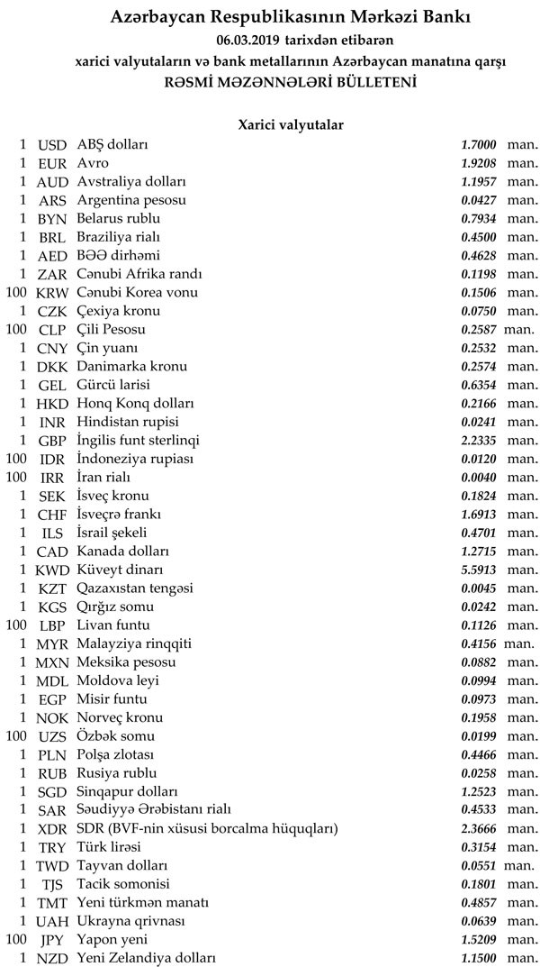 2019-cu ilin Mart ayının 6-na Mərkəzi Bankın açıqladığı rəsmi Dollar/Manat məzənnəsi Martın 5-i ilə müqayisədə dəyişməyərək 1,7000 manat olub, Avro/manat məzənnəsi 1.9208 manata düşüb, Rubl/manat məzənnəsi isə 0,0258 manata düşüb.