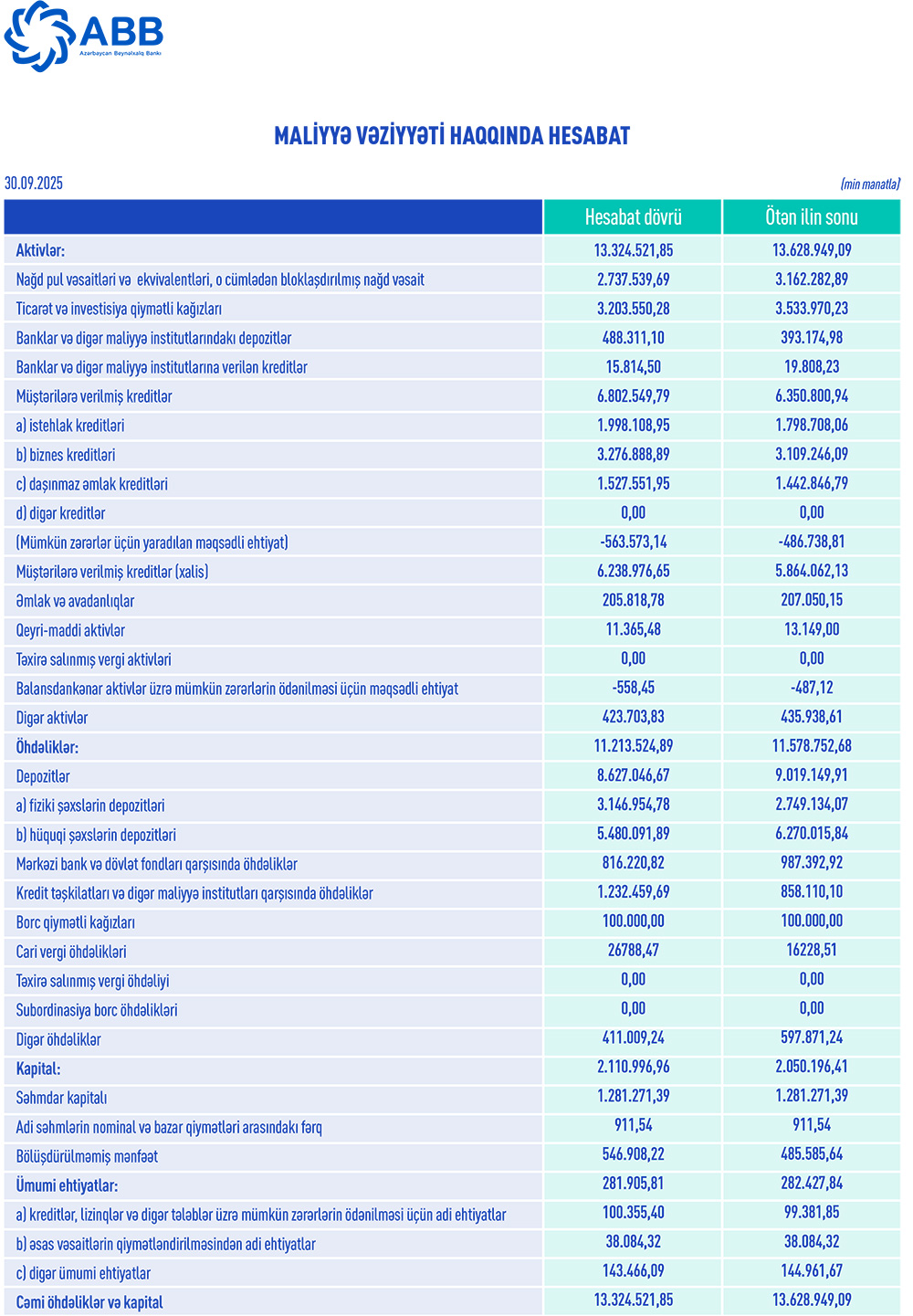30 sentyabr 2025-ci il tarixində ABB 1 milyard 813 milyon 88 min manat məcmu kapitala malik olub. I dərəcəlikapitalınadekvatlıq əmsalı16,98%,məcmu kapitalınadekvatlıqəmsalı 19,78% təşkil edib.