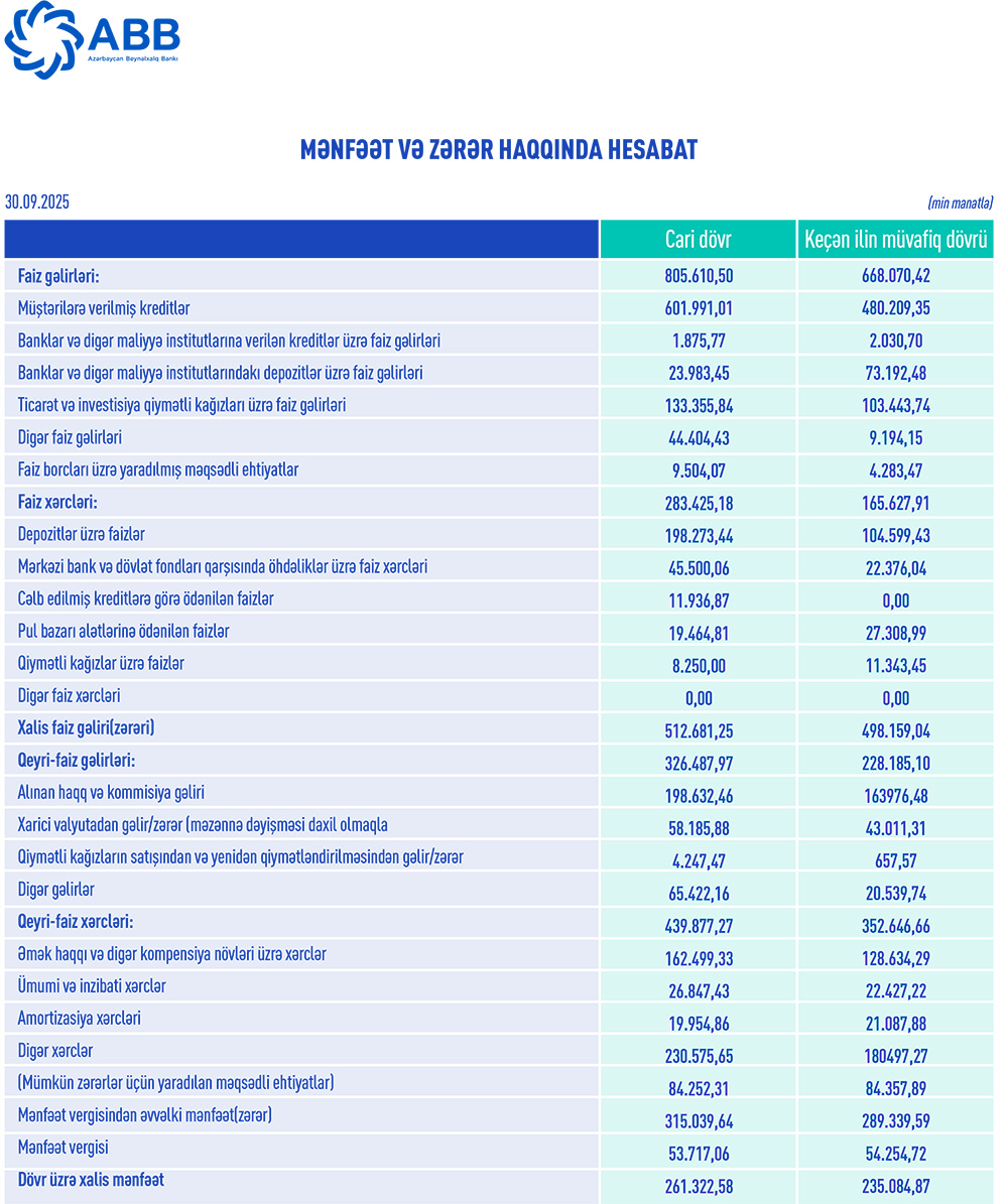2025-cü ilin 9 ayı ərzində ABB gəlirindən 9 milyon 504 min manat faiz borcları üzrə yaradılmış məqsədli ehtiyatlara ayırıb (ötən ilin eyni dövründə 4 milyon 283 min manat ayırmışdı). Bundan başqa Bank 84 milyon 252 min manat mümkün zərərlər üçün yaradılan məqsədli ehtiyatlara yönəldib (ötən ilin 9 ayında 84 milyon 358 min manat yönəltmişdi), 53 milyon 717 min manat mənfəət vergisi hesablanıb (ötən ilin 9 ayında 54 milyon 255 min manat hesablanmışdı).