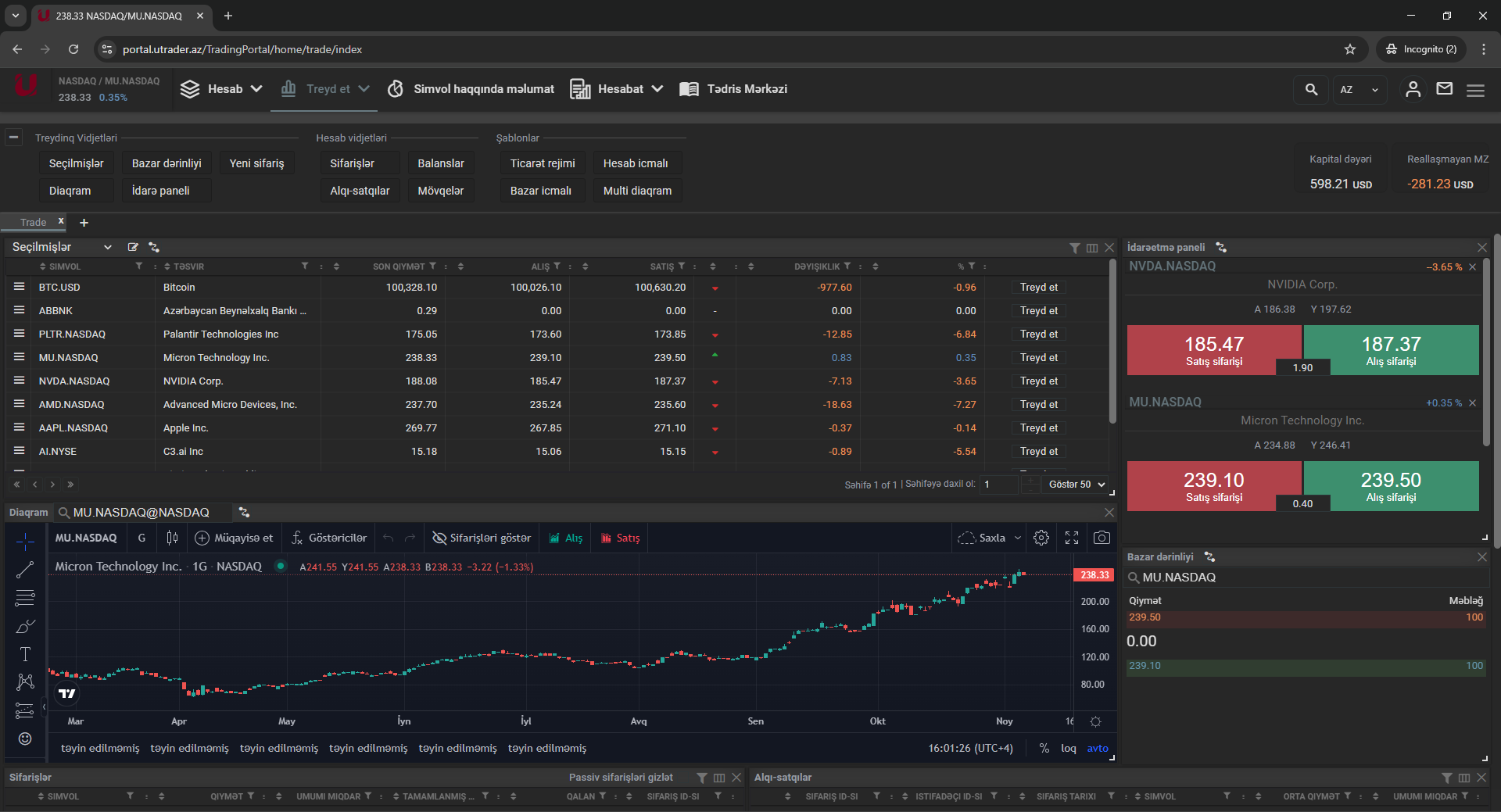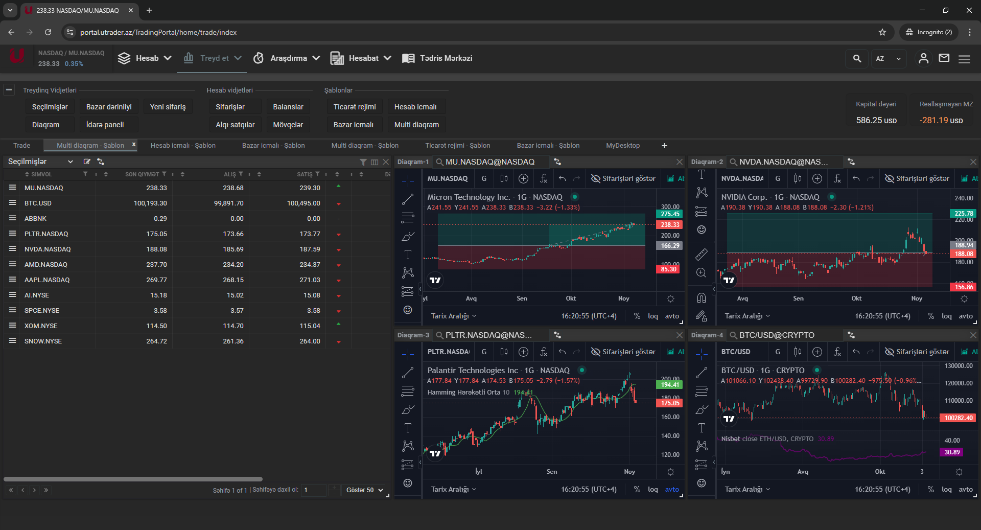 - Seçilmişlər paneli və multidiaqramlar: Qlobal bazarların alətlərini, qrafiklərini və real vaxtda qiymət dəyişikliklərini eyni ekranda izləmək imkanı;
