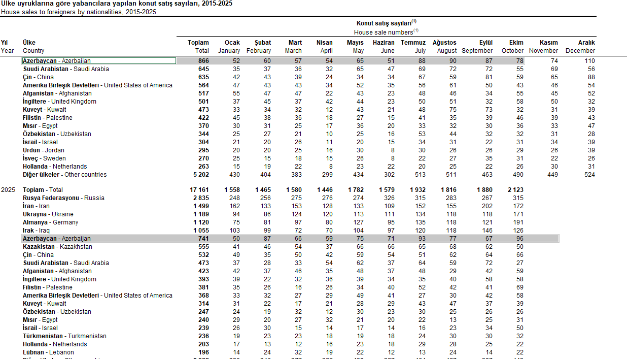 Türkiyə Statistika Qurumunun (TÜİK) 2025-ci ilin yanvar–oktyabr dövrü üzrə açıqladığı rəsmi məlumatlar Azərbaycanın Türkiyədən daşınmaz əmlak alışı üzrə mövqeyinin daha da gücləndiyini göstərir. Statistikaya əsasən, Azərbaycan vətəndaşları 2025-ci ilin ilk 10 ayında Türkiyədə ümumilikdə 741 mənzil alıblar ki, bu da ötən ilin analoji dövrü ilə müqayisədə nəzərəçarpacaq artımdır. 2024-cü ilin yanvar–oktyabr aylarında Türkiyədən cəmi 682 mənzil alan Azərbaycan vətəndaşları 2025-ci ildə bu göstəricini 59 mənzil və ya təxminən 8,6% artırıblar.Türkiyə Statistika Qurumunun (TÜİK) 2025-ci il yanvar–oktyabr dövrünə dair məlumatları Azərbaycan vətəndaşlarının Türkiyədə daşınmaz əmlak alışı üzrə artan tendensiyanı göstərir.