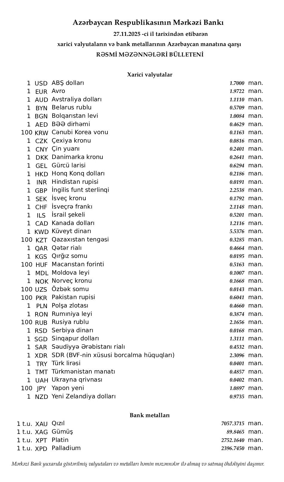 Rəsmi məzənnələr açıqlandı