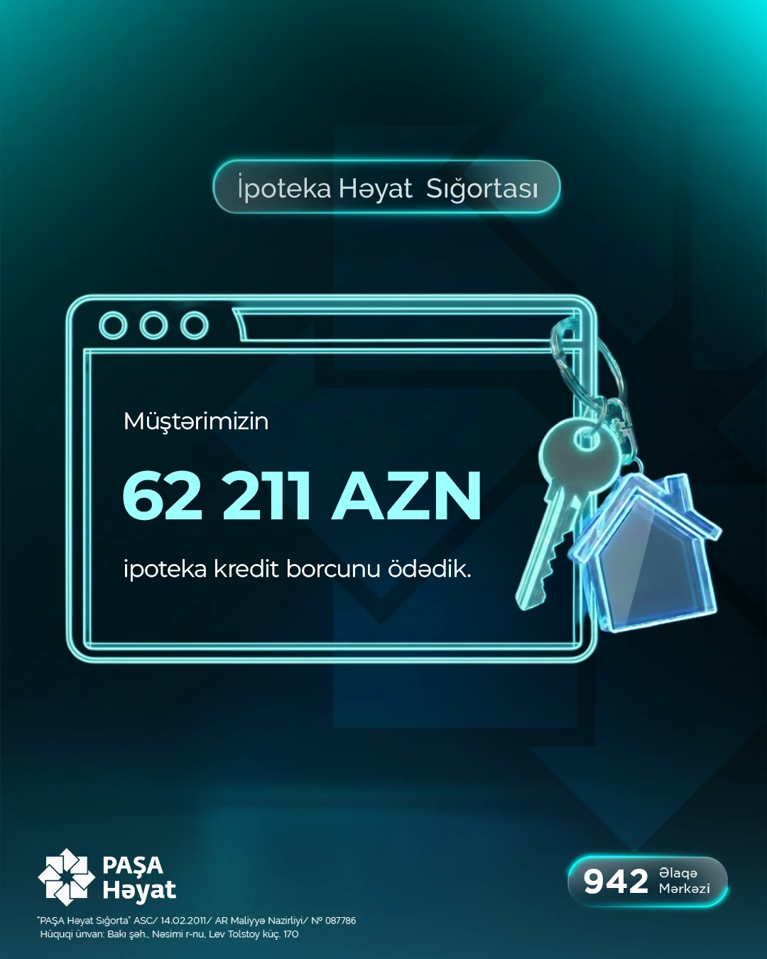 Müştərinin 62 min 211 manat qalıq kredit borcu məbləği “PAŞA Həyat” tərəfindən ödənilib“PAŞA Həyat Sığorta” şirkəti “kredit götürən şəxslərin həyat sığortası” növü üzrə növbəti iri həcmli sığorta ödənişinin məbləğini açıqlayıb.