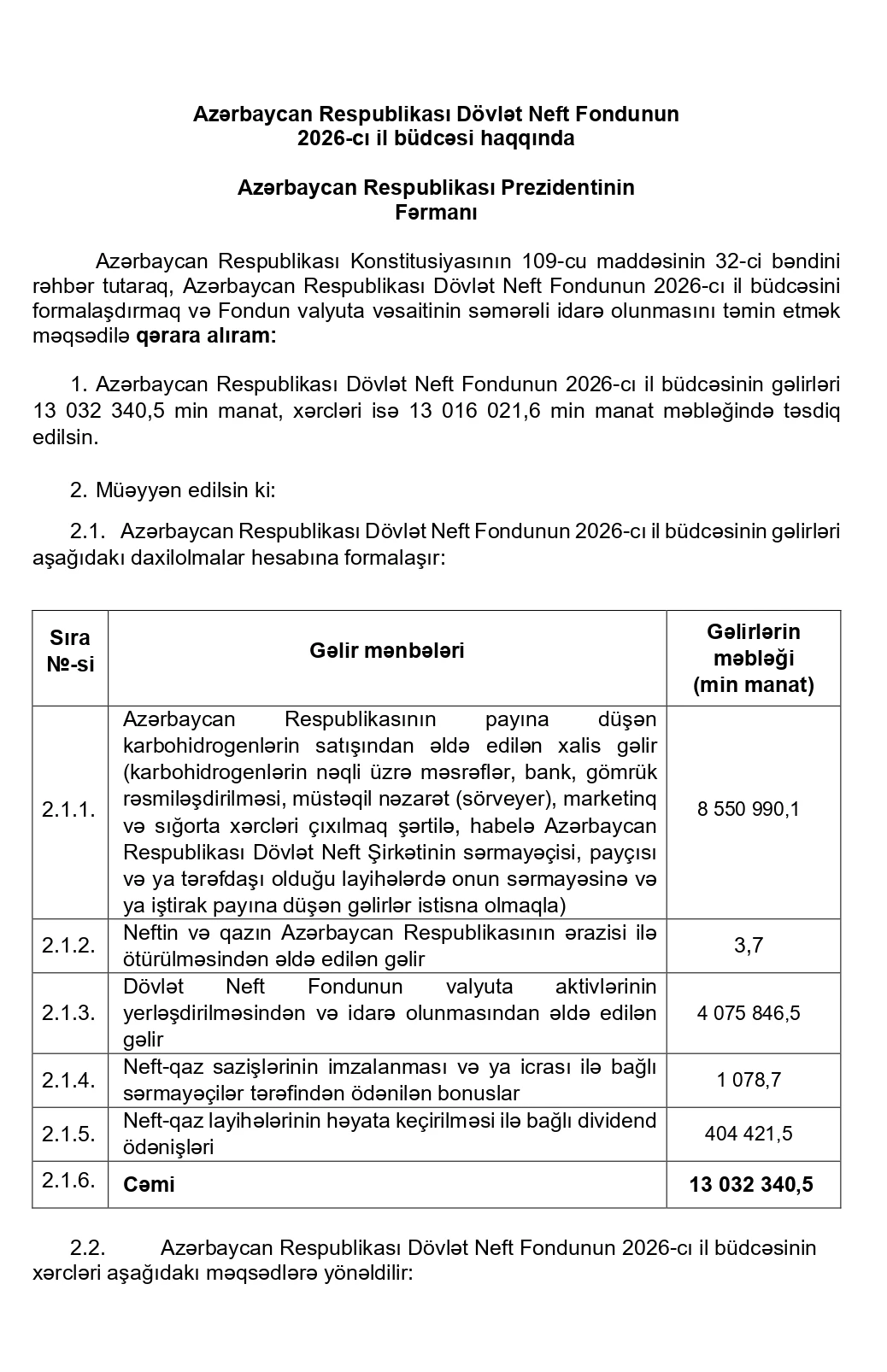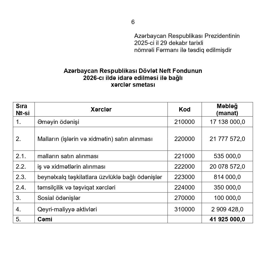 Azərbaycan Respublikası Prezidenti İlham Əliyev "Azərbaycan Respublikası Dövlət Neft Fondunun (ARDNF) 2026-cı il büdcəsi haqqında" Fərman imzalayıb.