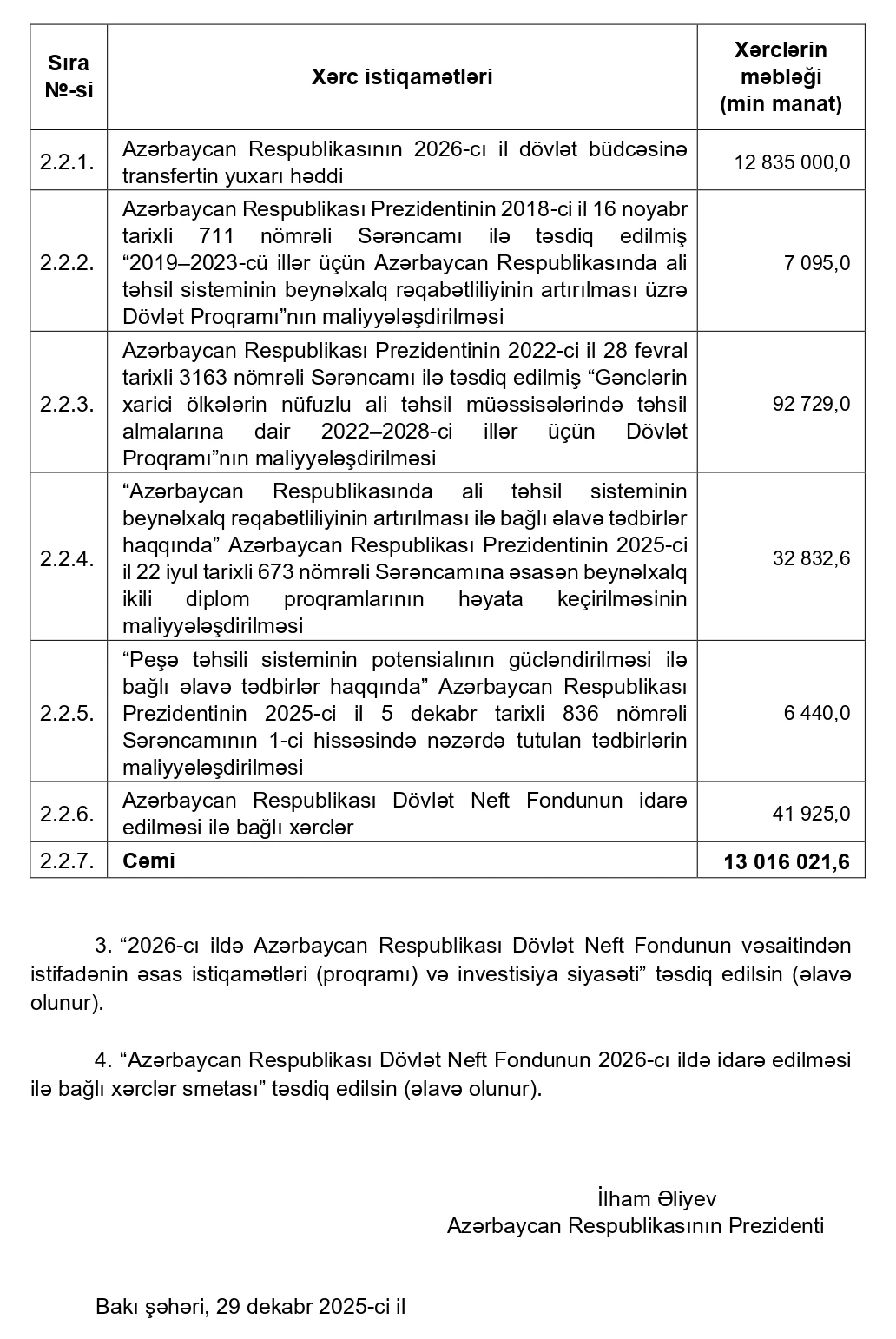 O cümlədən Azərbaycan Respublikasının 2026-cı il dövlət büdcəsinə transfertin yuxarı həddi 12 milyard 835 milyon manat təsdiq edilib.