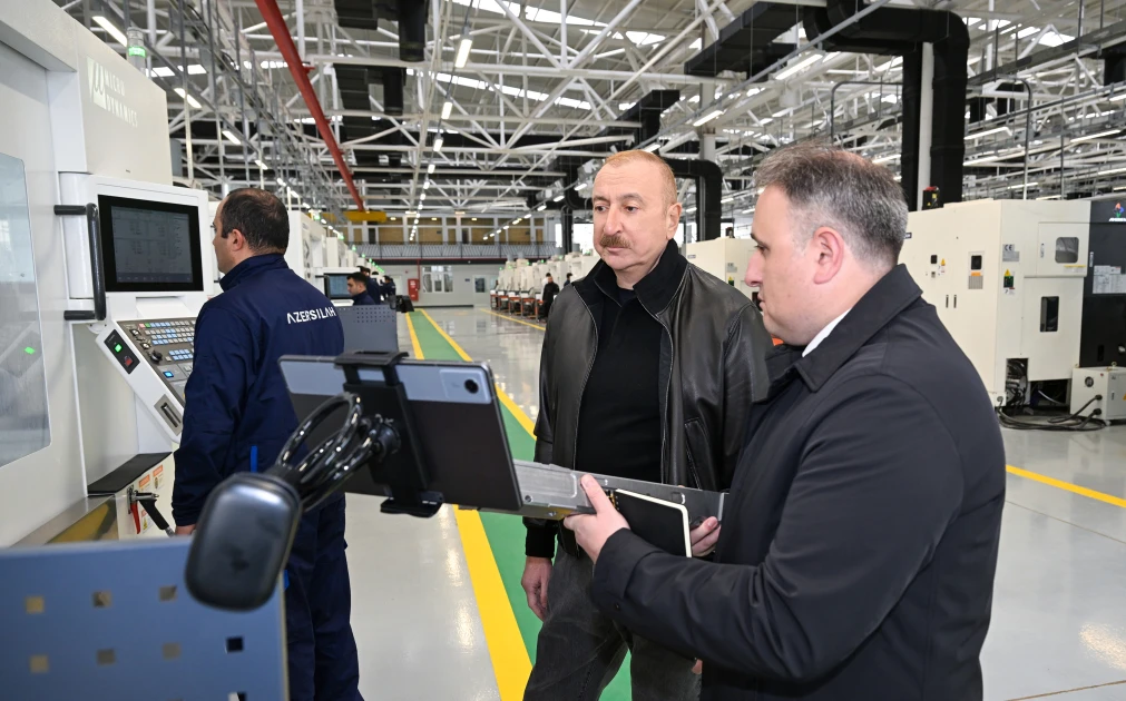 Dövlətimizin başçısı əvvəlcə Ulu Öndər Heydər Əliyevin zavodun həyətində ucaldılmış büstü önünə gül dəstəsi qoyub.