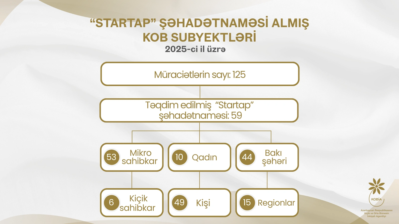 Agentliyin yaydığı məlumatda bildirilir ki, Nazirlər Kabinetinin 29 yanvar 2021-ci il tarixli Qərarı ilə təsdiq edilmiş “Startapın müəyyən olunması meyarları”na əsasən Ekspertlər Şurası tərəfindən 59 KOB subyektinə “Startap” şəhadətnaməsinin verilməsi barədə qərar qəbul olunub. Şəhadətnamə almış sahibkarların 48-i hüquqi, 11-i fiziki şəxs olmaqla, 53-ü mikro və 6-sı kiçik sahibkardır. 44 startap Bakı şəhərindən, 15-i isə regionlardandır. Şəhadətnamə almış sahibkarların 10-u qadın sahibkardır. Layihələrin 4-ü “yaşıl layihə”dir. “Startap” şəhadətnaməsi almış biznes subyektləri istehsal və xidmət sektorlarında fəaliyyət göstərir, startapların əsas istiqamətləri maliyyə, təhsil və səhiyyə texnologiyaları, e-ticarət və rəqəmsal marketinq, rəqəmsal ödəniş sistemləri və s. sahələrdə innovativ həlləri özündə ehtiva edir.