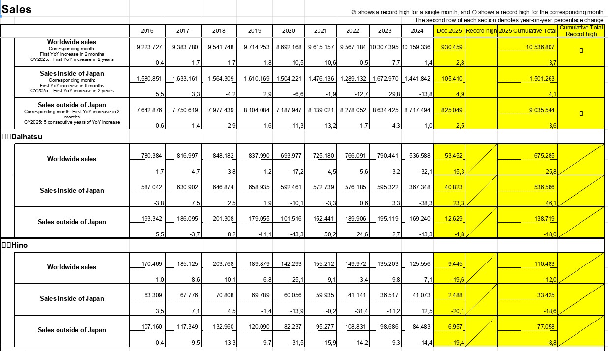 Toyota-nın qlobal qrup satışları əvvəlki ilə nisbətən 4,6 faiz artıb. Bu rəqəm Toyota və Lexus markaları ilə yanaşı, mini avtomobil istehsalçısı Daihatsu və yük maşınları istehsalçısı Hino Motors-un satışlarını da əhatə edir.