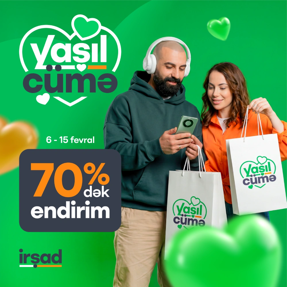 (®) 6–15 fevral tarixlərində İrşad müştəriləri “Yaşıl Cümə” kampaniyası çərçivəsində 70%-dək endirimlərdən və sərfəli hissəli ödəniş imkanlarından yararlana bilərlər.