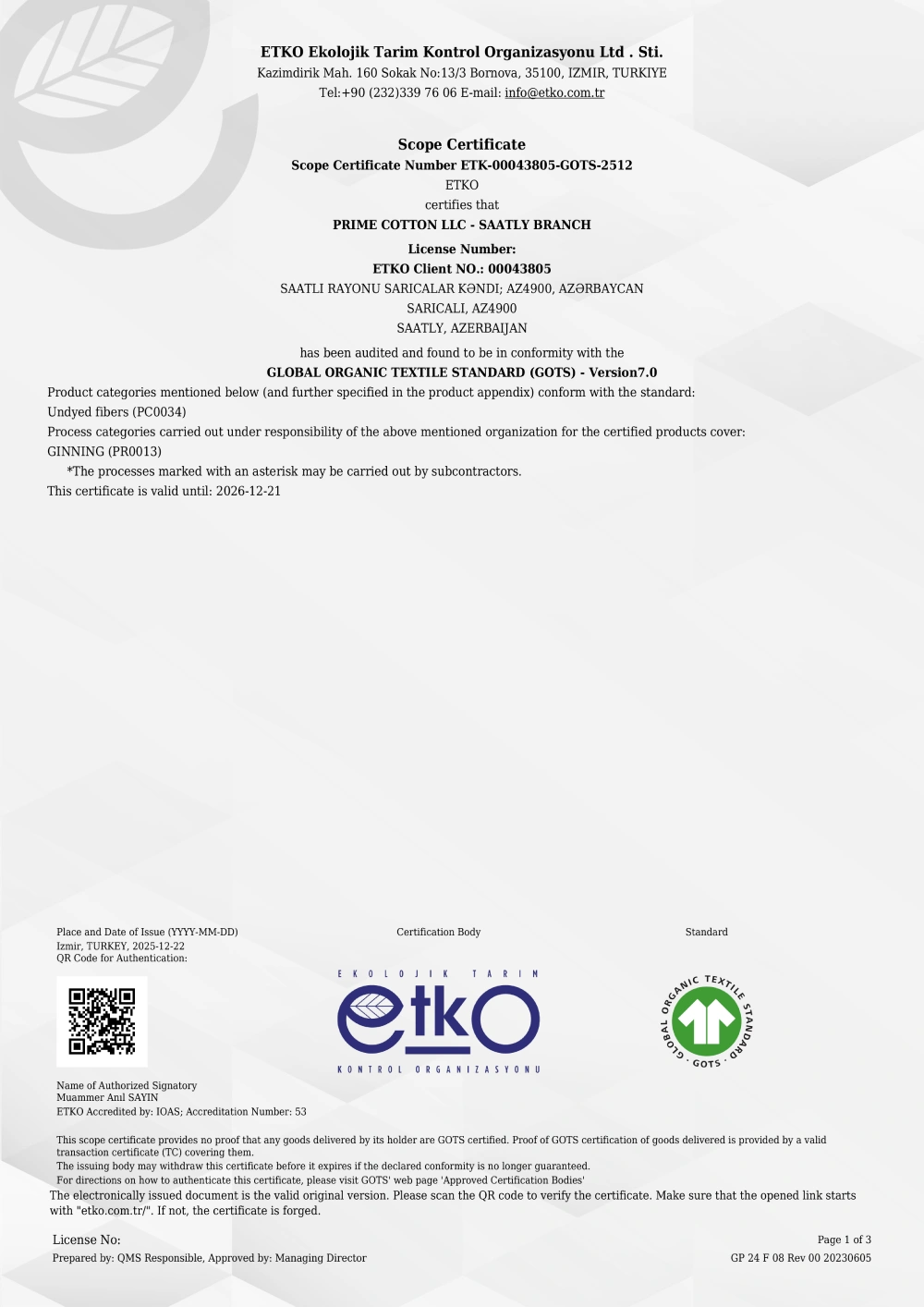 Qeyd edək ki, GOTS sertifikatı Prime Cotton MMC-nin artıq malik olduğu OEKO-TEX® Standard 100, USDA Organic, Higg FEM, Sedex Supplier Plus, ISO 9001:2015, ISO 14001:2015, ISO 45001:2018, Geodentify mənşə təsdiqi və International Cotton Association (ICA) üzvlüyü kimi beynəlxalq sertifikat və təşəbbüsləri tamamlayaraq şirkətin izlənəbilənlik və məsuliyyətli istehsal sahəsində formalaşmış lider mövqeyini möhkəmləndirir.