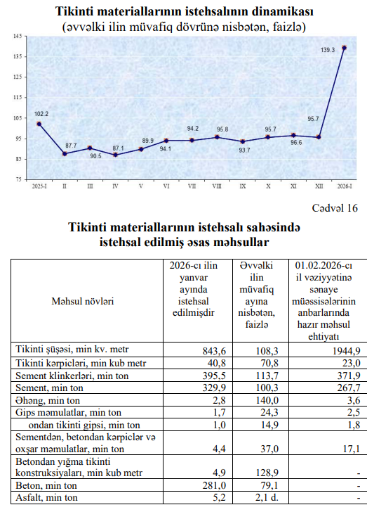 Tikinti materiallarının istehsalı sahəsində 2026-сı ilin yanvar ayında istehsalın ümumi dəyəri 117,8 milyon manat olmaqla, əvvəlki ilin müvafiq ayı ilə müqayisədə 39,3 faiz artmışdır. Ay ərzində asfalt istehsalı 2,1 dəfə, əhəng istehsalı 40 faiz, betondan yığma tikinti konstruksiyalarının istehsalı 28,9 faiz, sement klinkerlərinin istehsalı 13,7 faiz, sement istehsalı 0,3 faiz artmışdır.
