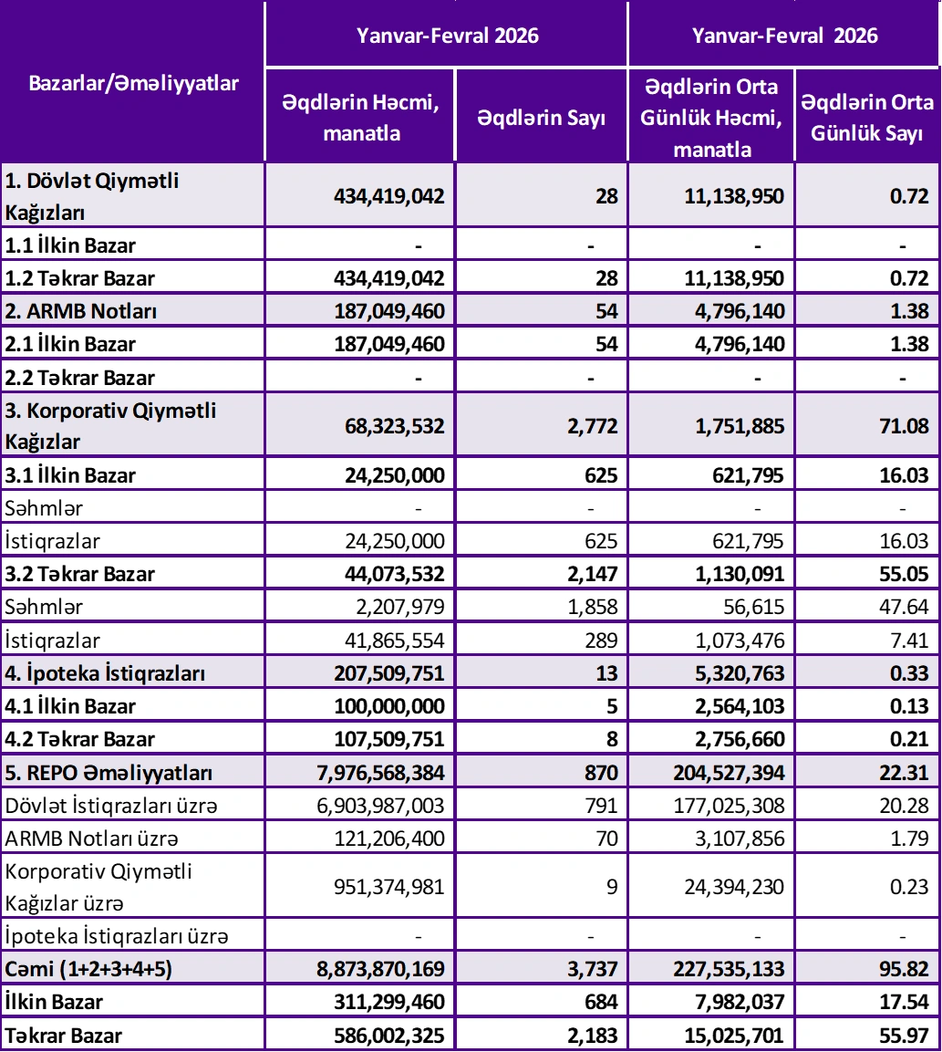 2026-cı ilin yanvar-mart dövründə Bakı Fond Birjasının (BFB) ticarət dövriyyəsinin həcmi 8 milyard 873 milyon 870 min manat təşkil edib.
