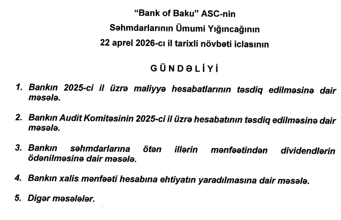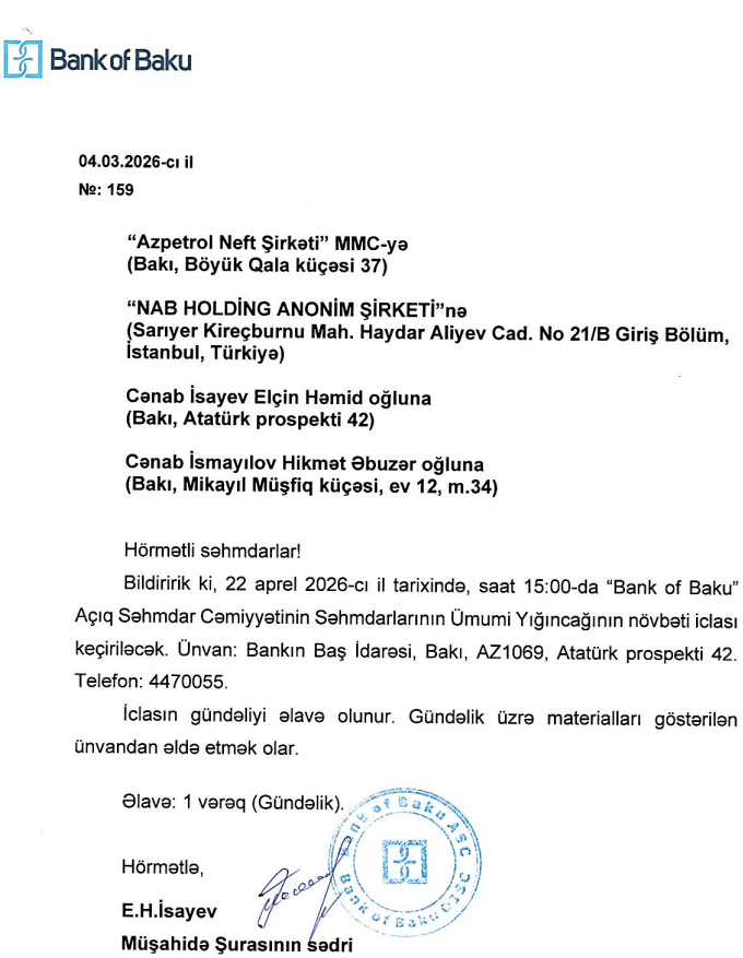 22 aprel 2026-cı il tarixində “Bank of Baku” ASC-nin Səhmdarlarının Ümumi Yığıncağının növbəti iclası keçiriləcək.