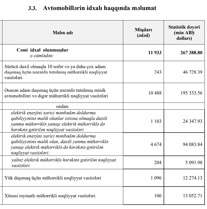 Elektrik və hibrid avtomobillər seqmentində isə fərqli tendensiyalar müşahidə olunur. Yalnız elektrik mühərriki ilə işləyən avtomobillərin idxalı 309 ədəddən 204 ədədə düşərək 105 ədəd və ya 34 faiz azalıb. Bu kateqoriya üzrə idxalın dəyəri isə daha kəskin geriləyərək 12,1 milyon dollardan 5,1 milyon dollara enib ki, bu da 7 milyon dollar və ya 57,9 faiz azalma deməkdir.