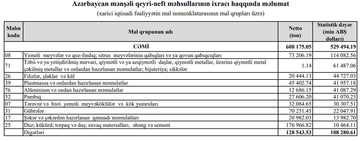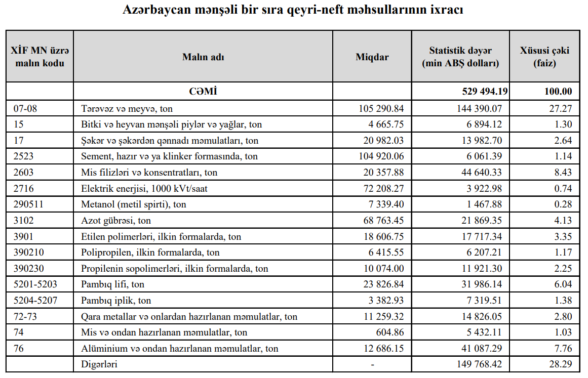 Azərbaycandan qeyri neft-qaz məhsullarının ixracı real ifadədə 20,7 faiz azalıb