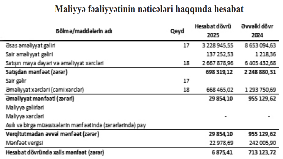 “Bakı-Əyrici-Toxucu” ASC 2025-ci ili təxminən 6 min 785 manat xalis mənfəət ilə başa vurub. Şirkət 2024-cü ili 713 min 124 manat xalis mənfəət ilə bağlamışdı. Beləliklə, “Bakı-Əyrici-Toxucu”nun xalis mənfəəti 104 dəfə azalıb.