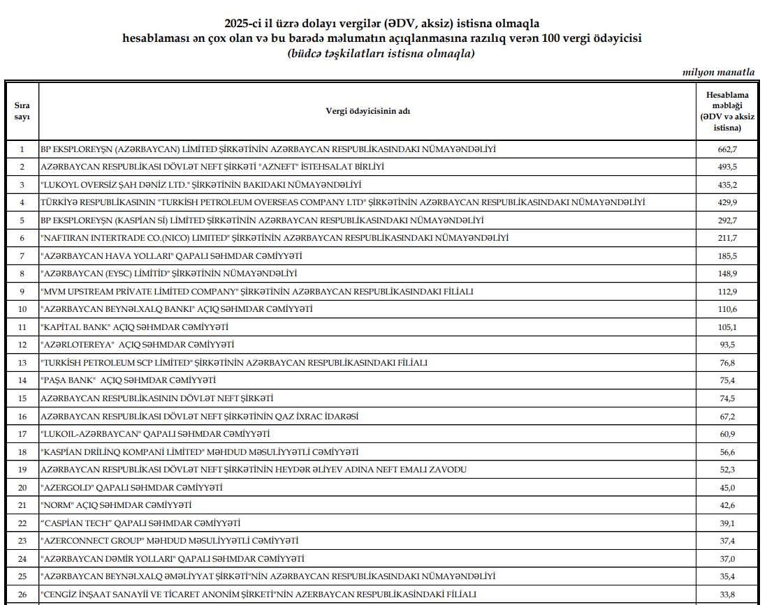 Dövlət Vergi xidməti "2025-ci il üzrə dolayı vergilər (ƏDV, aksiz) istisna olmaqla hesablaması ən çox olan və bu barədə məlumatın açıqlanmasına razılıq verən 100 vergi ödəyicisi (büdcə təşkilatları istisna olmaqla)" siyahısını da dərc edib.