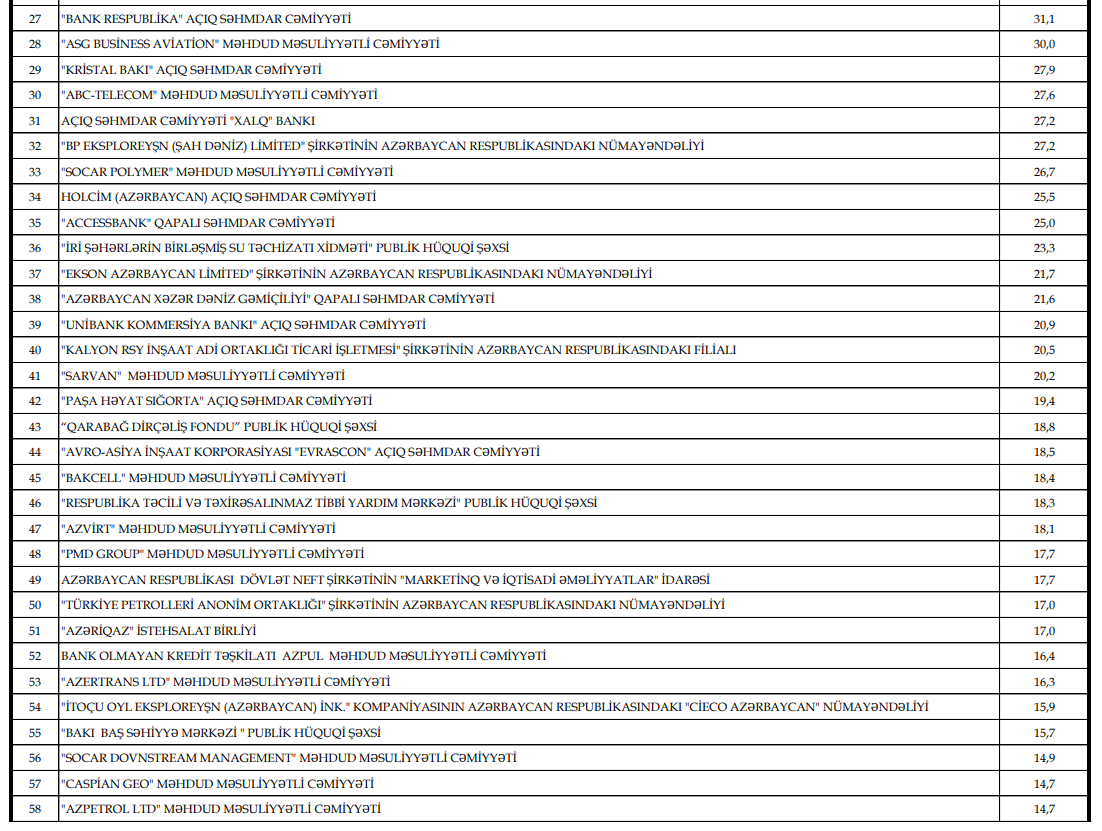 Qeyd edək ki, "Dövlət Vergi xidməti 2025-ci ildə ən çox vergi ödəyən və bu barədə məlumatın açıqlanmasına razılıq verən 100 vergi ödəyicisi (büdcə təşkilatları istisna olmaqla)" siyahısını da dərc edib.