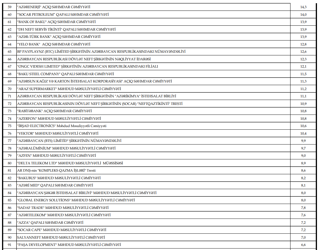 Dolayı vergilər (ƏDV, aksiz) istisna olmaqla hesablaması ən çox olan 100 vergi ödəyicisi - SİYAHI