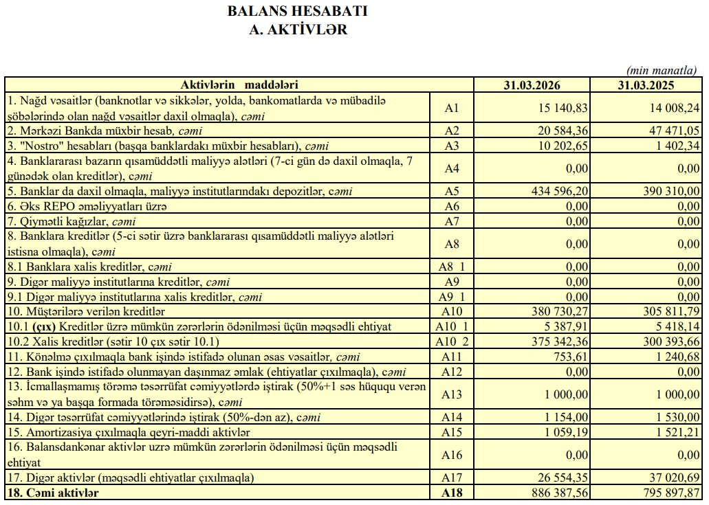 2026-cı ilin 31 mart tarixinə bankın cəmi aktivləri 886 milyon 388 min manat təşkil edib. Bu, 2025-ci ilin sonu ilə müqayisədə 90 milyon 490 min manat və ya 11,4 % artım deməkdir. 2025-ci ilin 31 dekabr tarixində bankın aktivləri 795 milyon 898 min manat səviyyəsində idi.