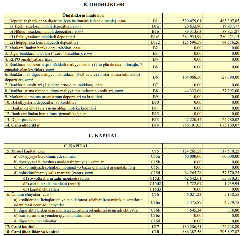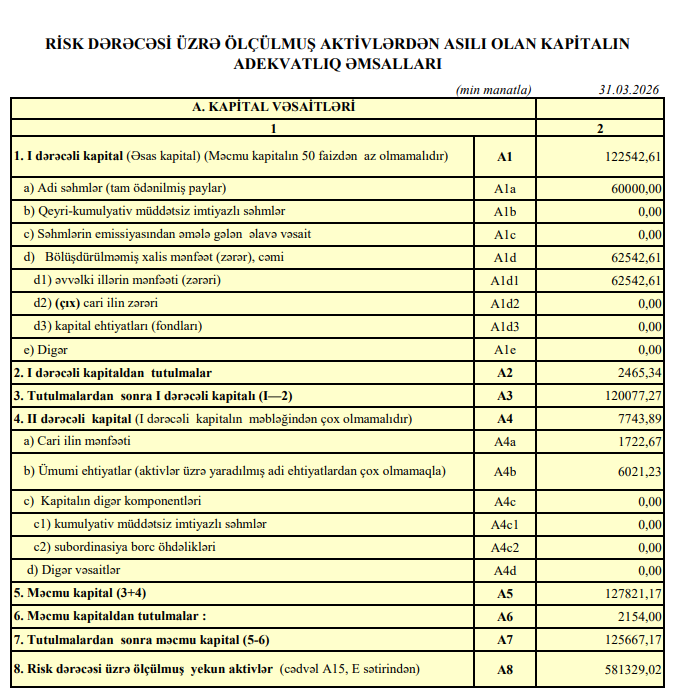 2026-cı ilin 31 mart tarixinə bankın məcmu kapitalı 125 milyon 667 min manat təşkil edib. Bu, 2025-ci ilin sonu ilə müqayisədə 2 milyon 60 min manat və ya 1,7 % artım deməkdir. 2025-ci ilin sonunda bankın kapitalı 123 milyon 607 min manat idi.