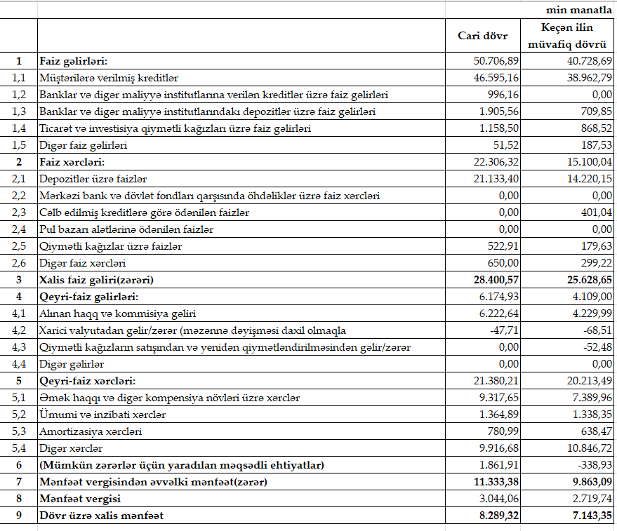 Qeyri-faiz gəlirləri isə 6 milyon 175 min manat olub ki, bu da illik müqayisədə 2 milyon 66 min manat və ya 50,3 % artım deməkdir.