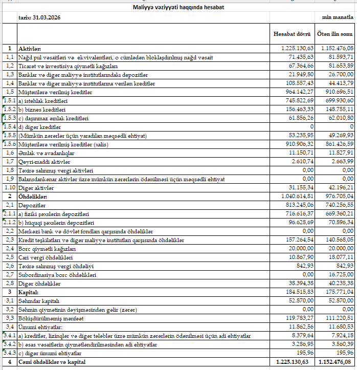 2026-cı ilin 31 mart tarixinə bankın depozit portfeli 813 milyon 245 min manat olub. Bu göstərici 2025-ci ilin sonu ilə müqayisədə 72 milyon 988 min manat və ya 9,9 % artıb.