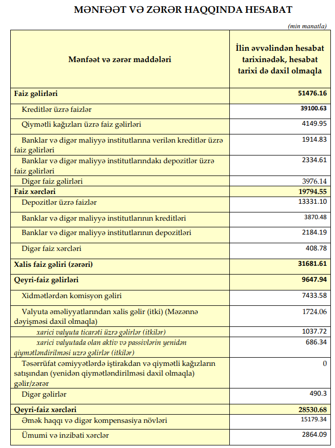 2026-cı ilin ilk rübündə bankın faiz gəlirləri 51 milyon 476 min manat təşkil edib. Bu göstərici ötən ilin eyni dövrü ilə müqayisədə 2 milyon 862 min manat və ya 5,9 % artıb.