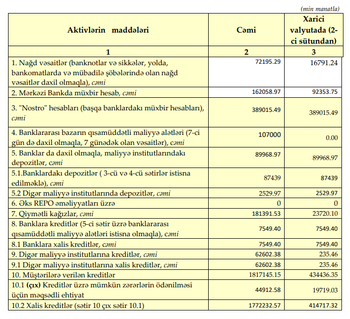 2026-cı ilin 31 mart tarixinə Xalq Bankın cəmi aktivləri 3 milyard 20 milyon 791 min manat təşkil edib. Bu göstərici 2025-ci ilin sonu ilə müqayisədə 23 milyon 317 min manat və ya 0,8 % azalıb.