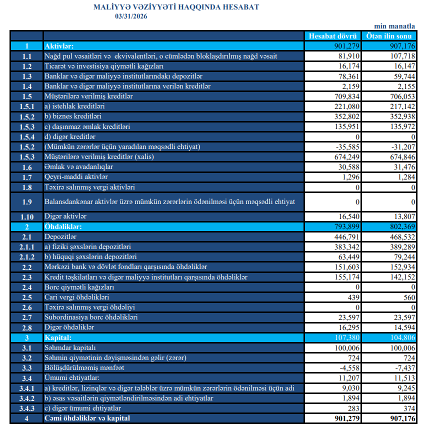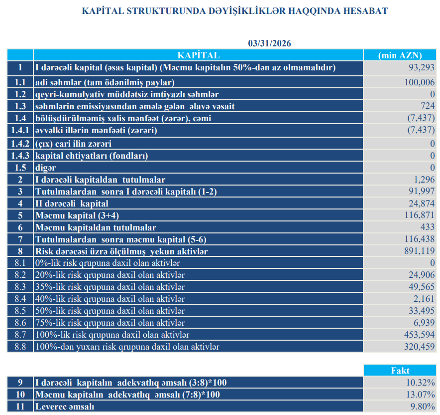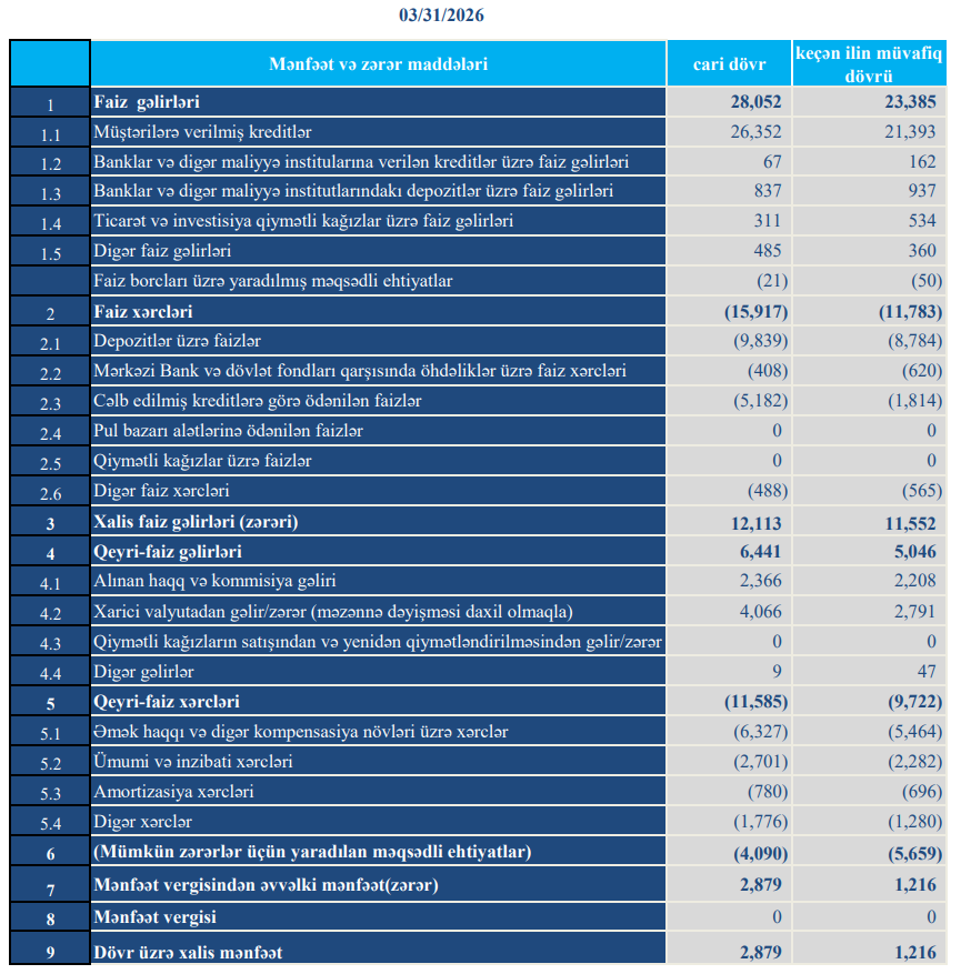 Bank 2025-ci ilin ilk rübünü 1 milyon 216 min manat xalis mənfəət ilə bağlamışdı.
