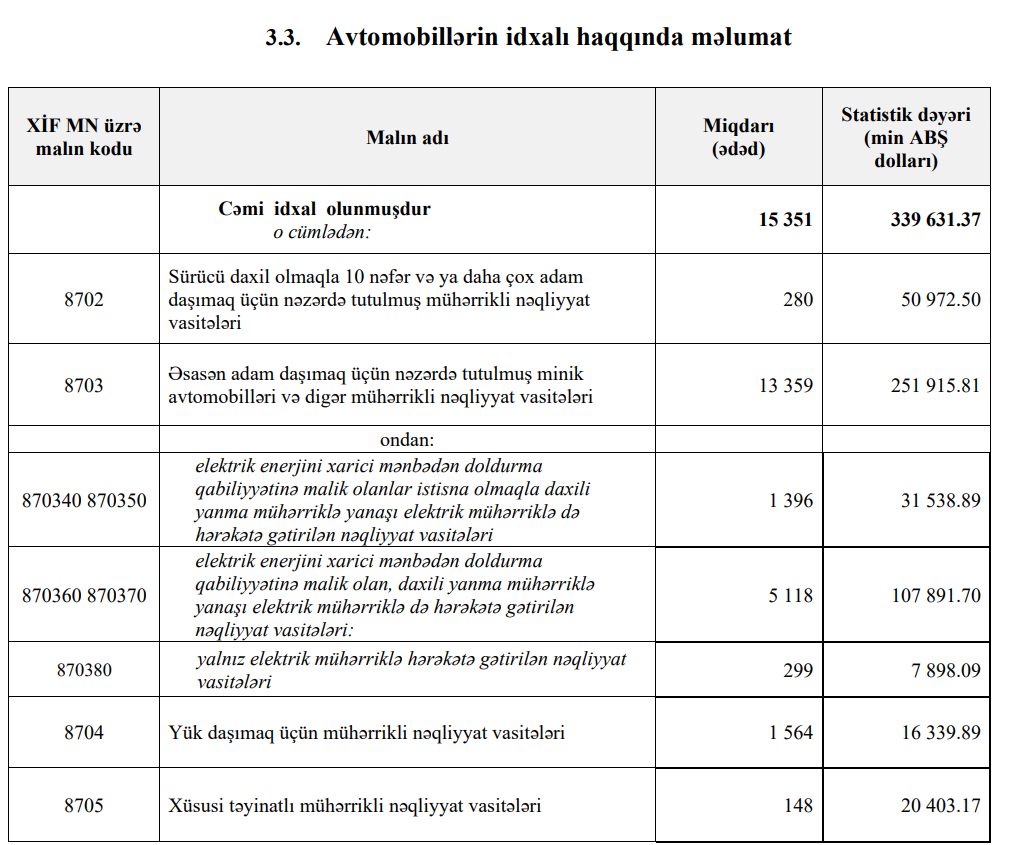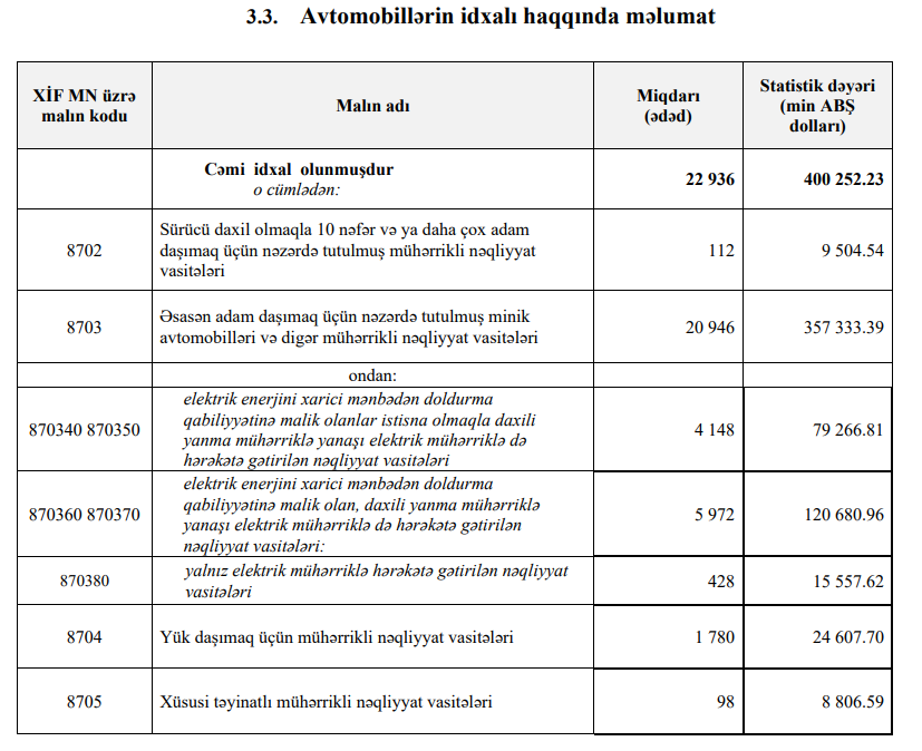 2025-ci ilin 1-ci rübündə Azərbaycana 400 milyon 252 min dollar dəyərində 22 miln 936 ədəd avtomobil idxal olunub. Beləliklə, 2026-cı ilin ilk rübündə Azərbaycana 7 min 585 ədəd və ya 33% az avtomobil idxal olunub.